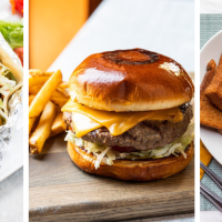 Beef patty, smoked brisket, smoked cheddar, golden barbecue sauce, mixed greens, pickled onions, crispy garlic, spicy mustard, brioche bun, choice of house-made potato salad or fries